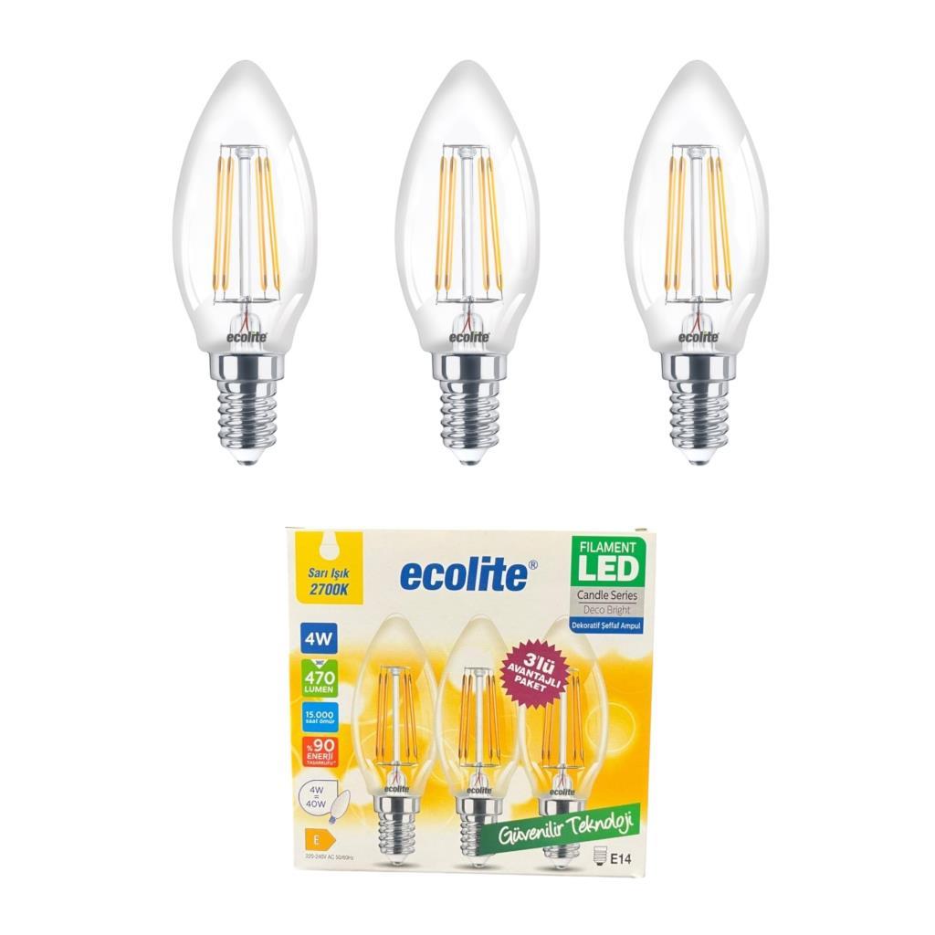 Ecolite 4W LED Filament Mum Ampul, E14 Duy, 2700K Sarı Işık, 470 Lümen, Şeffaf Cam, Akkor Görünümlü Dekoratif Lamba, 3'lü Paket