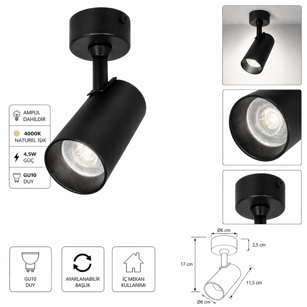 Minimal siyah kasa tasarımı ile salon, koridor, yatak odası, banyo, mağaza ve ofis gibi birçok iç mekanda dekoratif uyum sağlar. Tavan veya duvara kolayca monte edilebilen yapısı sayesinde pratik kurulum imkanı sunar. Ürün, kutu içeriğinde bulunan 4000K naturel ışık 4,5W GU10 ampul ile birlikte kullanıma hazırdır. İhtiyaç halinde farklı GU10 ampuller ile de uyumludur.