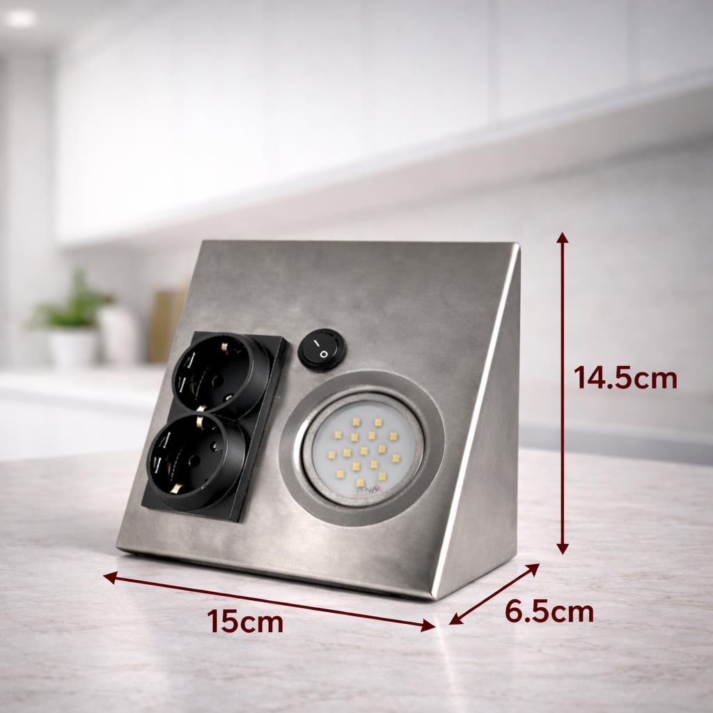 Üzerinde bulunan çift priz çıkışı, elektrikli cihazlarınızı kolayca bağlamanızı sağlarken, entegre LED aydınlatması ile tezgah üzerinde homojen ve göz yormayan bir ışık oluşturur. 3000K sıcak ışık rengi, özellikle mutfak ve yaşam alanlarında sıcak ve konforlu bir atmosfer sağlar.